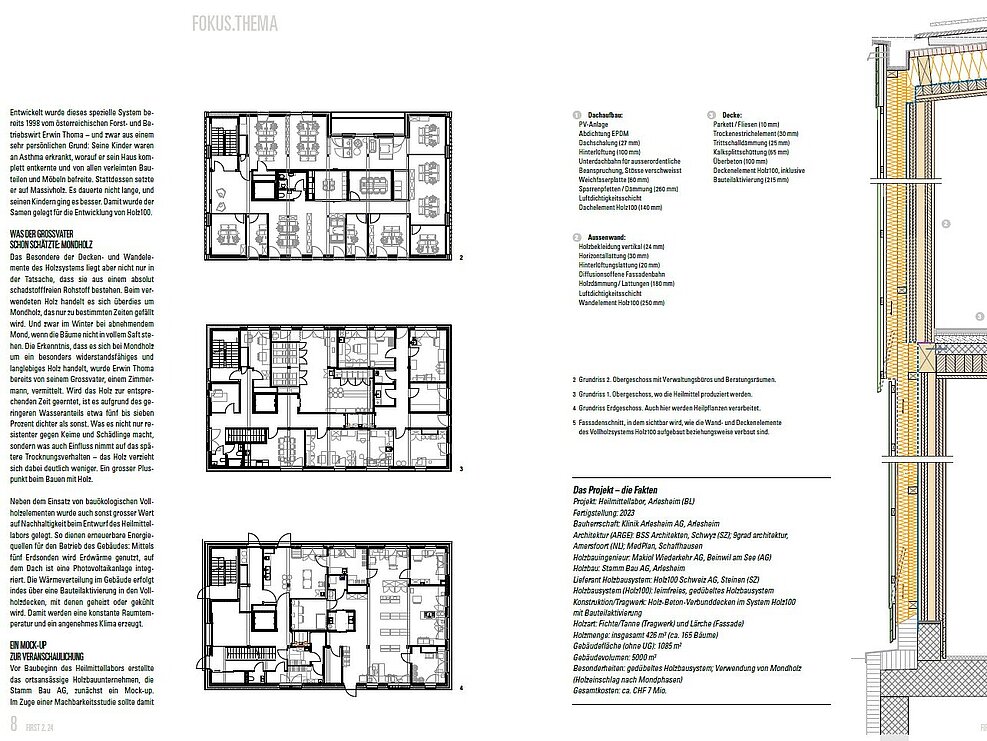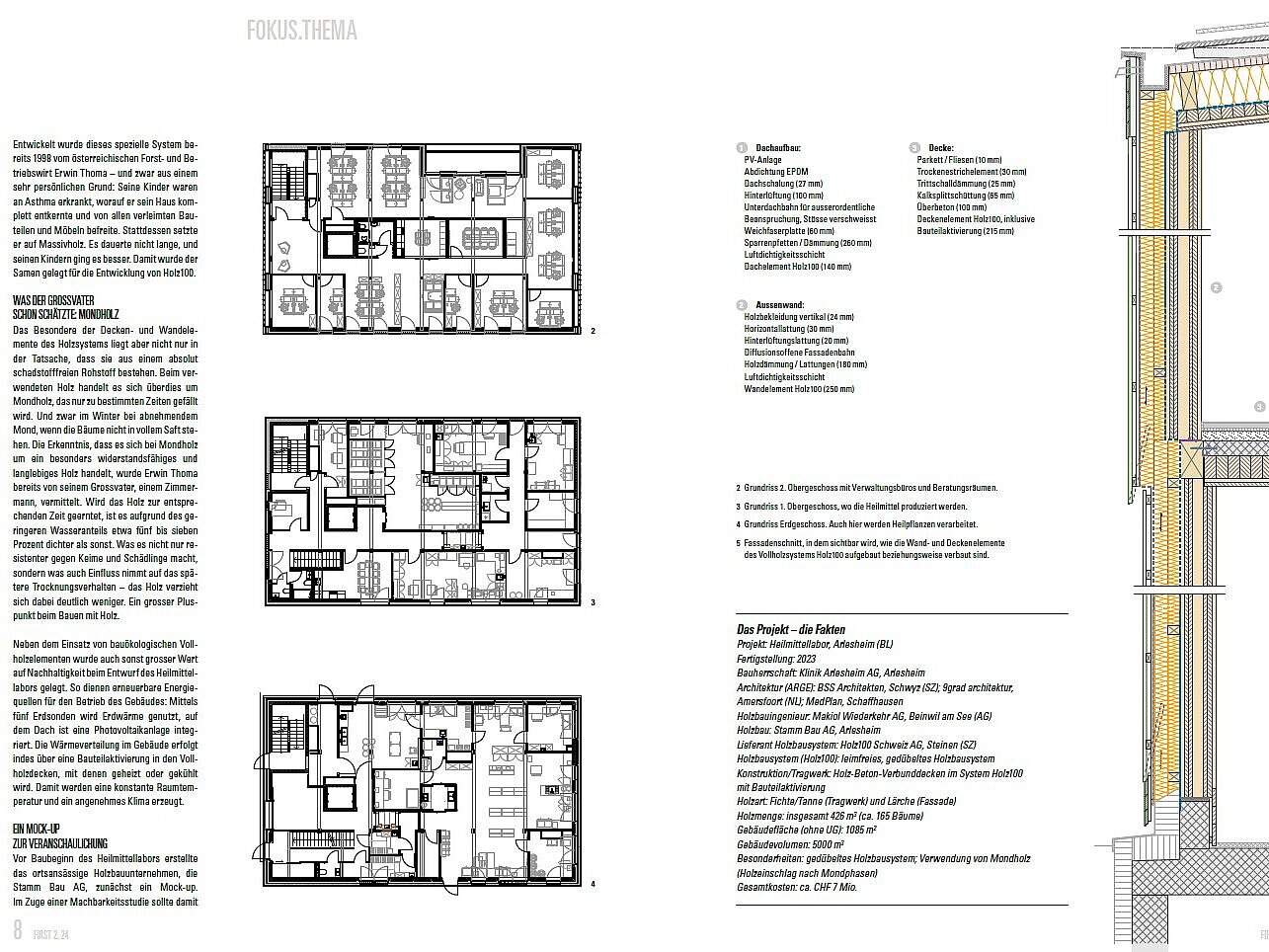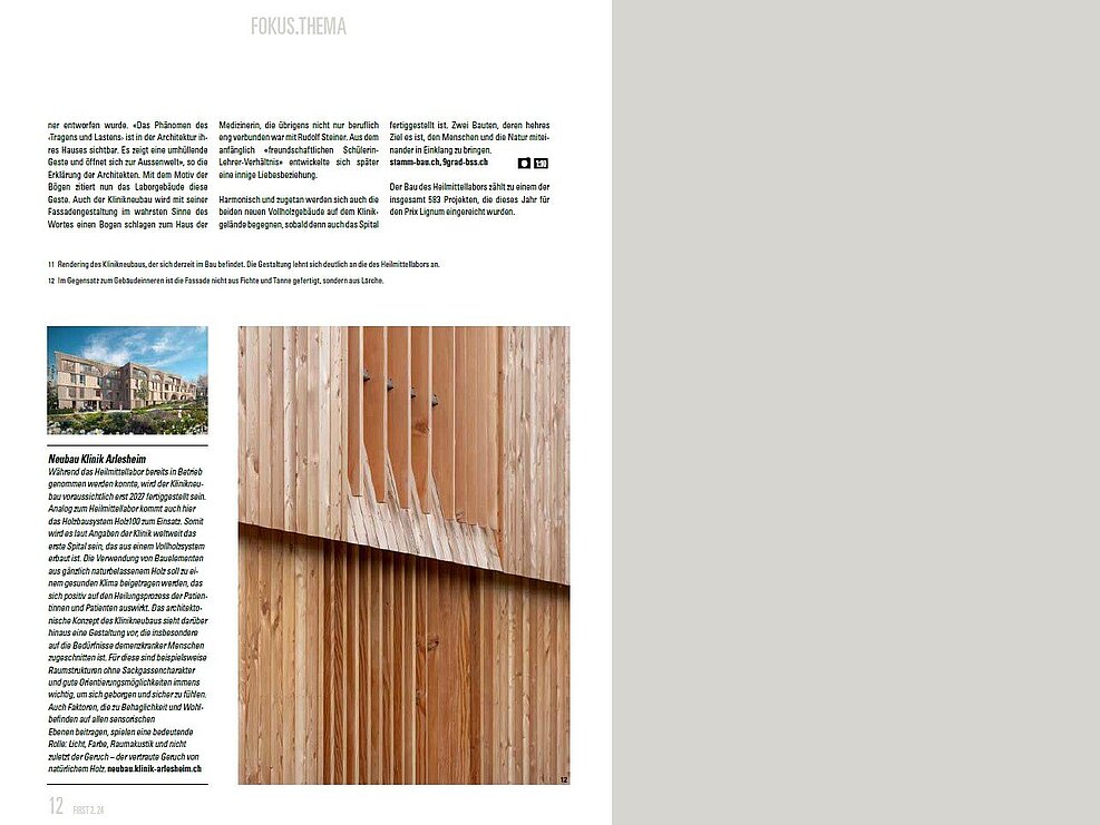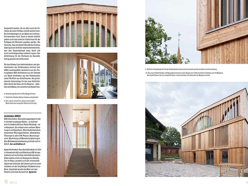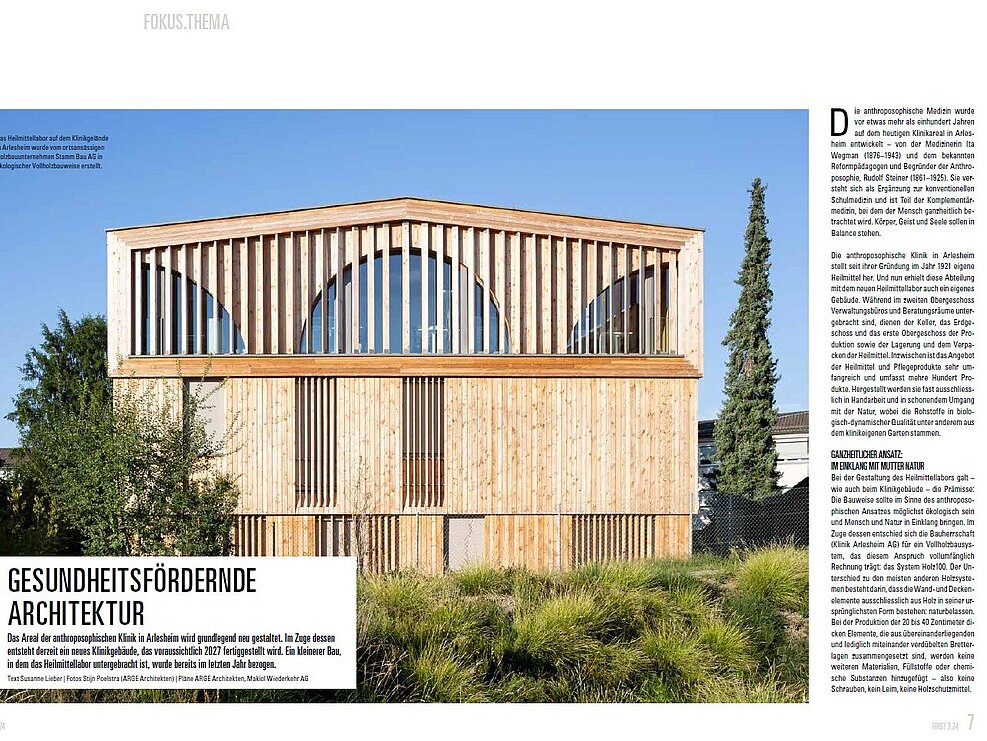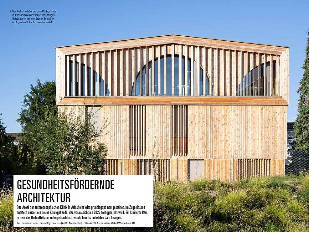 Uit het artikel: “Bij de vormgeving van het laboratorium voor natuurgeneesmiddelen gold – net als bij de kliniek zelf – het uitgangspunt: De bouwmethode moet volgens de antroposofische gedachte zo ecologisch mogelijk zijn en mens en natuur in harmonie brengen. Daarom koos de opdrachtgever (Kliniek Arlesheim) voor een massief houten bouwsysteem dat deze filosofie compleet omarmt: het bouwsysteem Holz100. Het onderscheid met de meeste andere houtbouwsystemen is dat de wand- en vloerelementen uitsluitend bestaan uit hout in zijn puurste vorm: onbehandeld en natuurlijk.