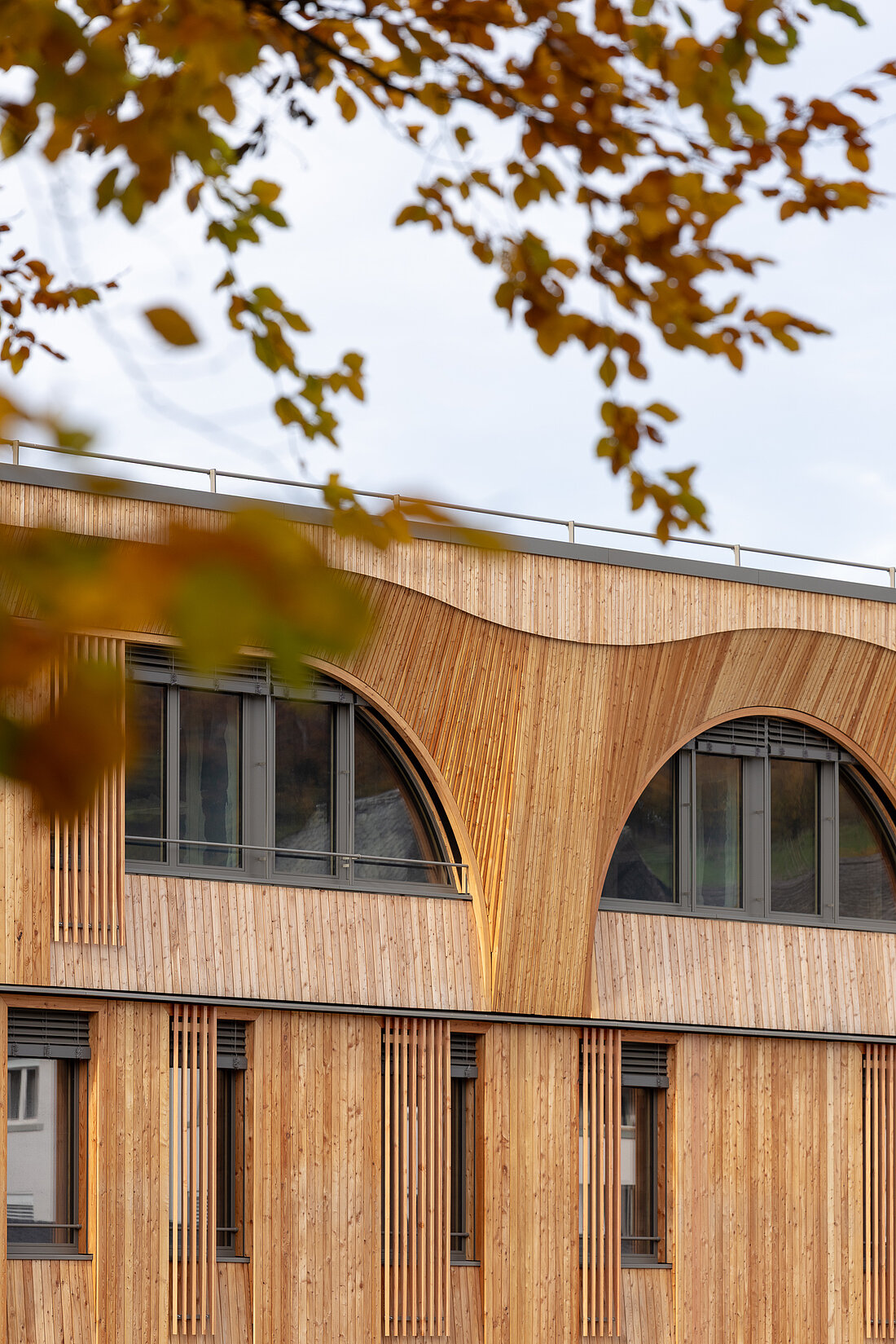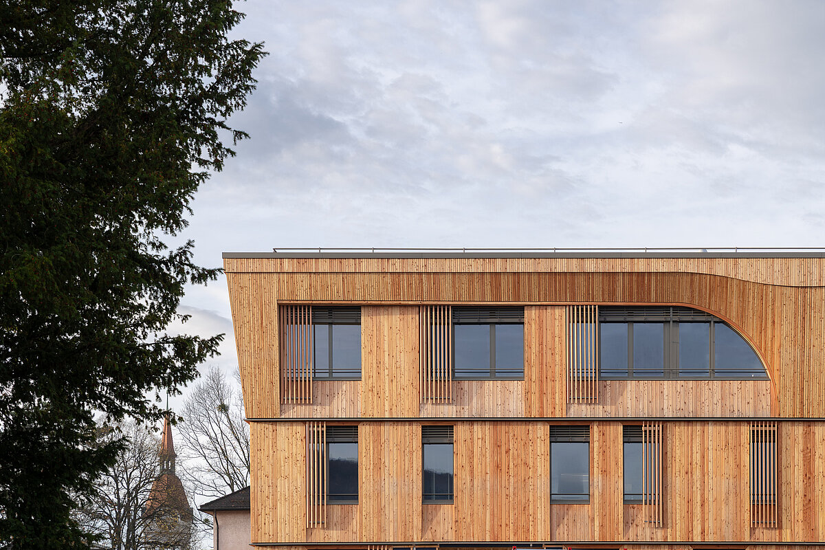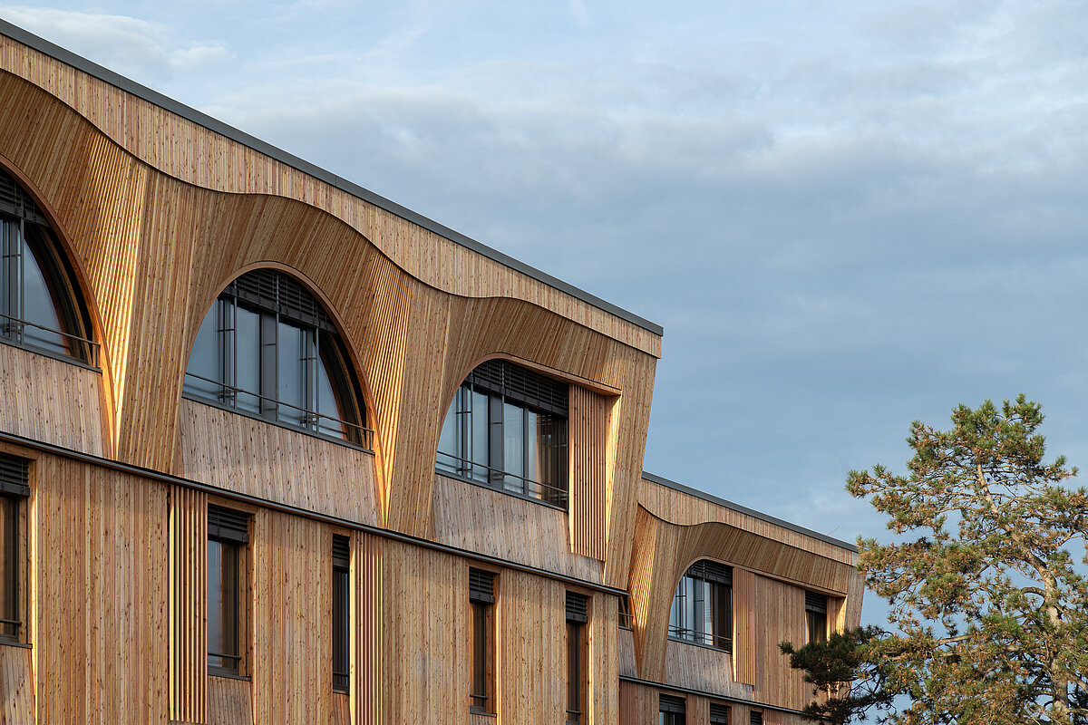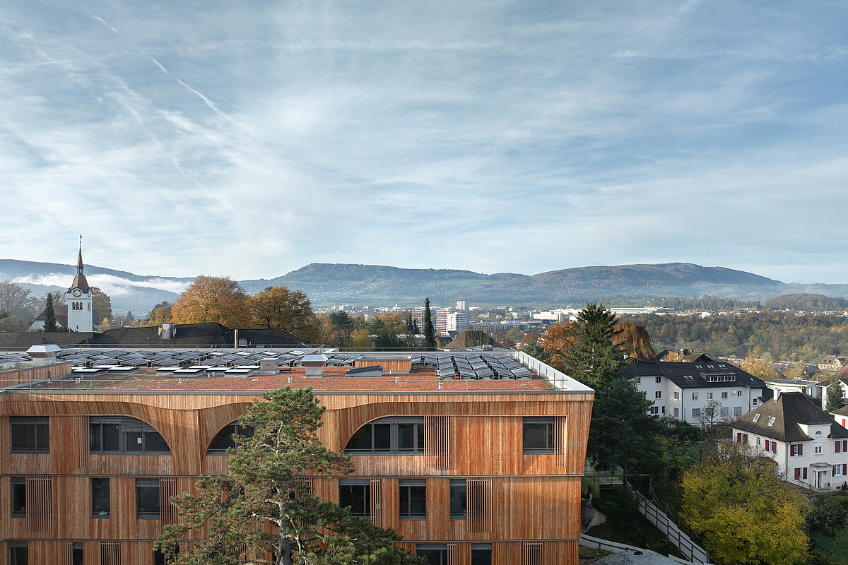 De Kliniek Arlesheim heeft een hoge duurzaamheidsambitie voor de nieuwbouw op haar terrein. In een interactief proces zijn vijf duurzaamheidsthema’s vastgelegd waarbij de nadruk wordt gelegd op bouwbiologie. Als eerste is het van belang dat toegepaste materialen natuurlijk en onvervalst zijn. We hebben zoveel mogelijk natuurlijke, biobased en hernieuwbare grondstoffen uitgekozen die een positieve impact hebben op het milieu. De toegepaste materialen worden op een eerlijke manier verwerkt en blijven zichtbaar, dus hout blijft hout, beton blijft beton. Ten tweede staat de geur van het gebouw centraal. Materialen moeten niet alleen een aangename geur verspreiden, maar ook vrij zijn van toxische dampen, gifstoffen en allergenen. Het derde thema is de natuurlijke regulering van de luchtvochtigheid, door middel van dampopen materialen zoals hout en leem. Thema vier draait om het minimaliseren van het energieverbruik door hernieuwbare energiebronnen. In de nieuwbouw wordt gebruik gemaakt van innovatieve bouwdeelactivering. Dit is een lage-temperatuursysteem, waarbij leidingen met verwarmd of gekoeld water in de kern van de Holz100 vloeren worden gelegd. Hierdoor ontstaat een zeer aangenaam, gezond en comfortabel binnenklimaat. Bij het laatste thema staat de lokale en regionale herkomst van grondstoffen centraal. Zo komt het speciale maanhout uit het Zwarte Woud in Duitsland. Het resultaat hiervan is een minimalisatie van het energieverbruik, het behalen van de Minenergie P-standaard van Zwitserland en de opslag van meer dan 2.000.000 kg CO2 in het aanwezige hout.