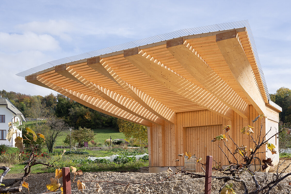 In de nieuwbouw van het preparatenpaviljoen worden preparaten bereid en verwerkt en worden presentaties en workshops over duurzame landbouw gegeven. De belangrijkste functie van het paviljoen is het bieden van een beschutte en overdekte buitenruimte waar de tuiniers hun preparaten kunnen voorbereiden in de buitenlucht. Het meest opvallende element van dit paviljoen is dan ook het grote organische dakoverstek. Ons ontwerp bestaat uit een opvallende houten constructie met gedraaide spanten die als luifel fungeren. De getordeerde spanten doen denken aan ontluikende bloemen en gaan een interessante relatie aan met de omliggende bebouwing. Kijkend vanonder de luifel verwijzen de houten spanten naar het Heizhaus (ketelhuis) op het terrein, oorspronkelijk ontworpen door Rudolf Steiner.