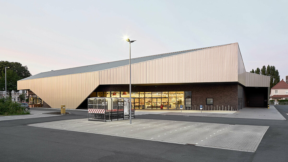 De nieuwe supermarkt in de wijk Deichhorst in Delmenhortst neemt de rooilijn over van de bestaande gebouwen in de omgeving. De nieuwbouw ligt aan een drukke weg met hele diverse bebouwing. De supermarkt heeft een karakteristiek dak en een uitnodigende etalage richting de straat.